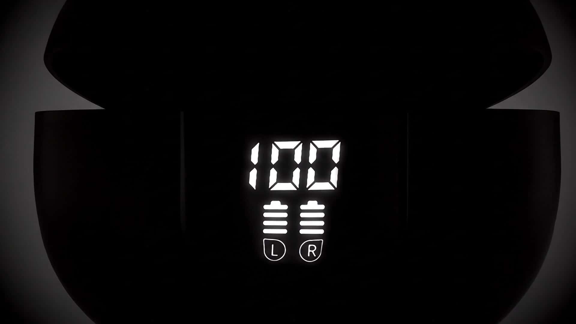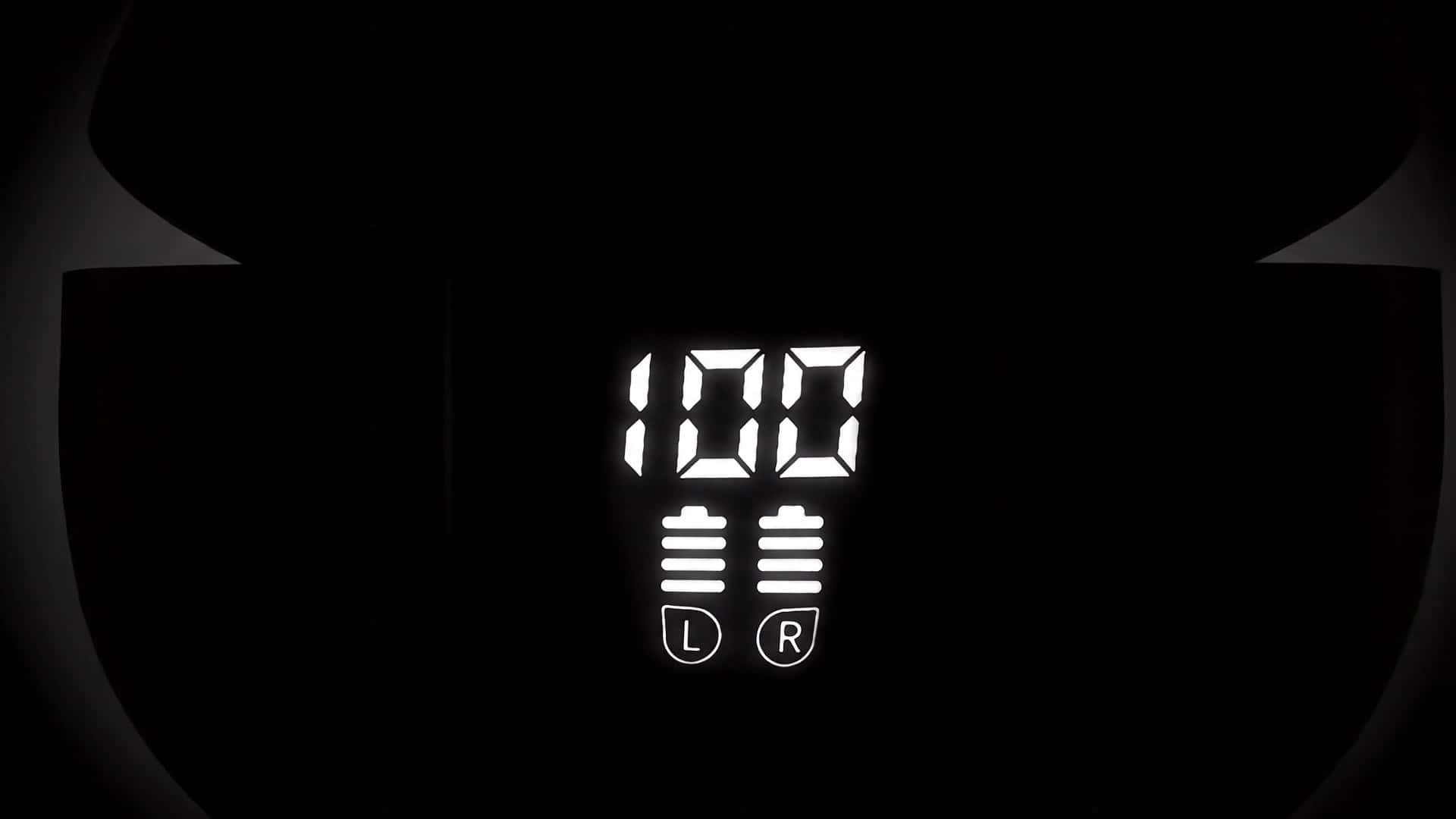 Na case, a luz branca indica o status da bateria e do carregamento: piscando durante carga, acesa quando completa e ativa enquanto recarrega os fones.