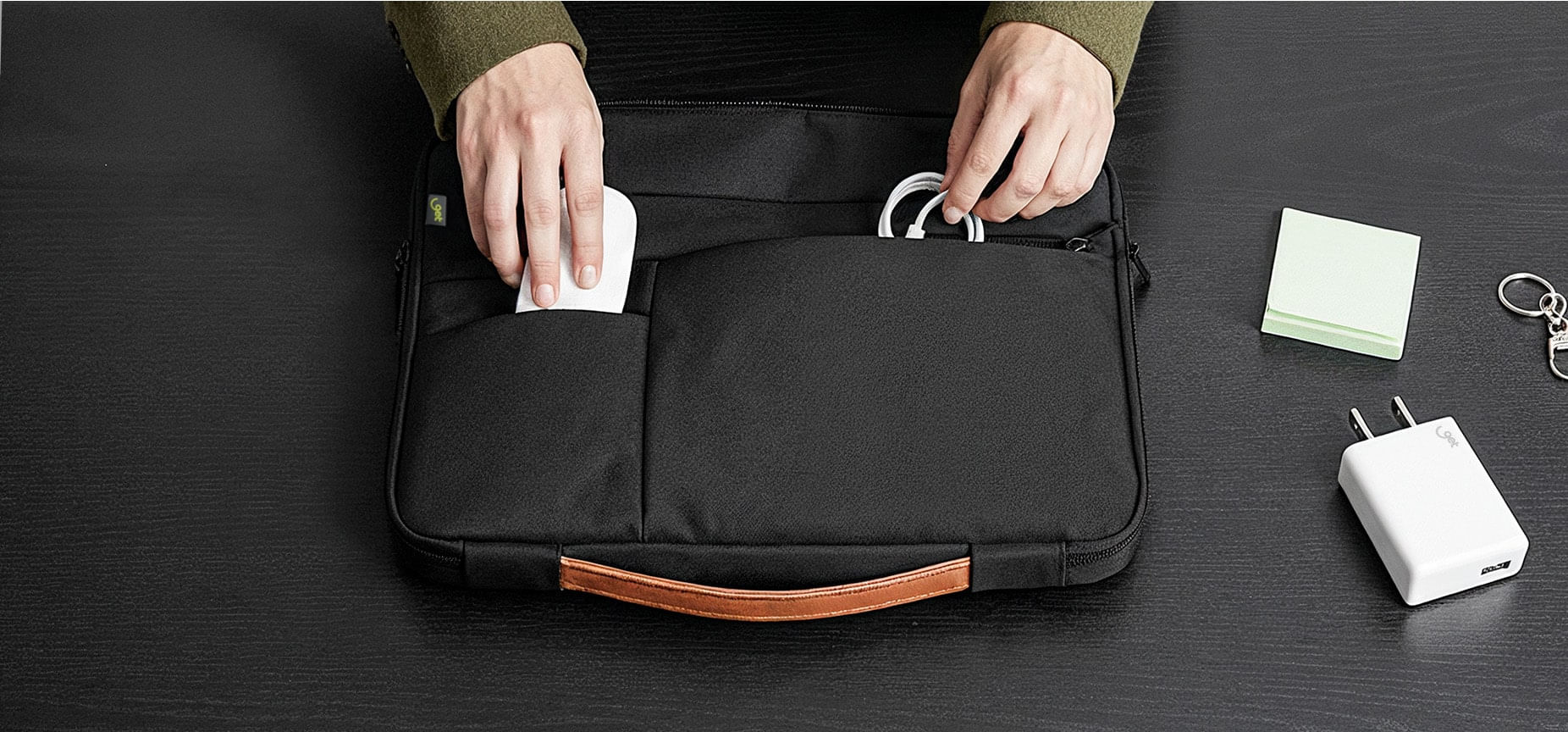 Cada um dos 5 bolsos foi desenhado para otimizar o espaço e simplificar a rotina. Carregador, cabos e acessórios ficam sempre à mão, sem comprometer o design slim. Um detalhe pensado para quem precisa de agilidade em cada movimento.